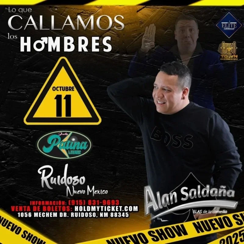 Get ready to laugh with Alan Saldaña in Lo Que Callamos los Hombres—his all-new comedy show hitting Ruidoso on October 11! Taking place at Just Patina Lounge, this night of humor and sharp observations promises nonstop fun. Tickets available now at holdmyticket.com or call (915) 831-9693. Don’t miss it!