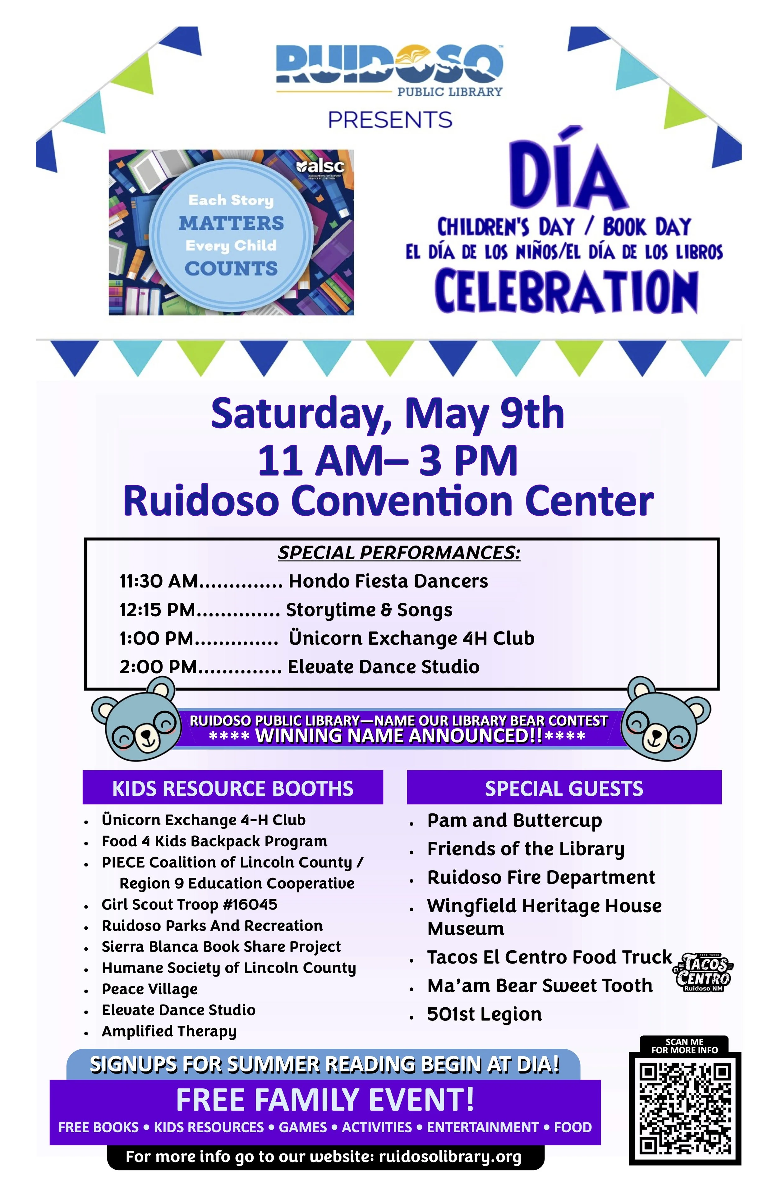 Join the Ruidoso Public Library for the 5th Annual Día Celebration—Children’s Day/Book Day on Saturday, May 9, 2026, from 11 AM to 3 PM at the Ruidoso Convention Center.