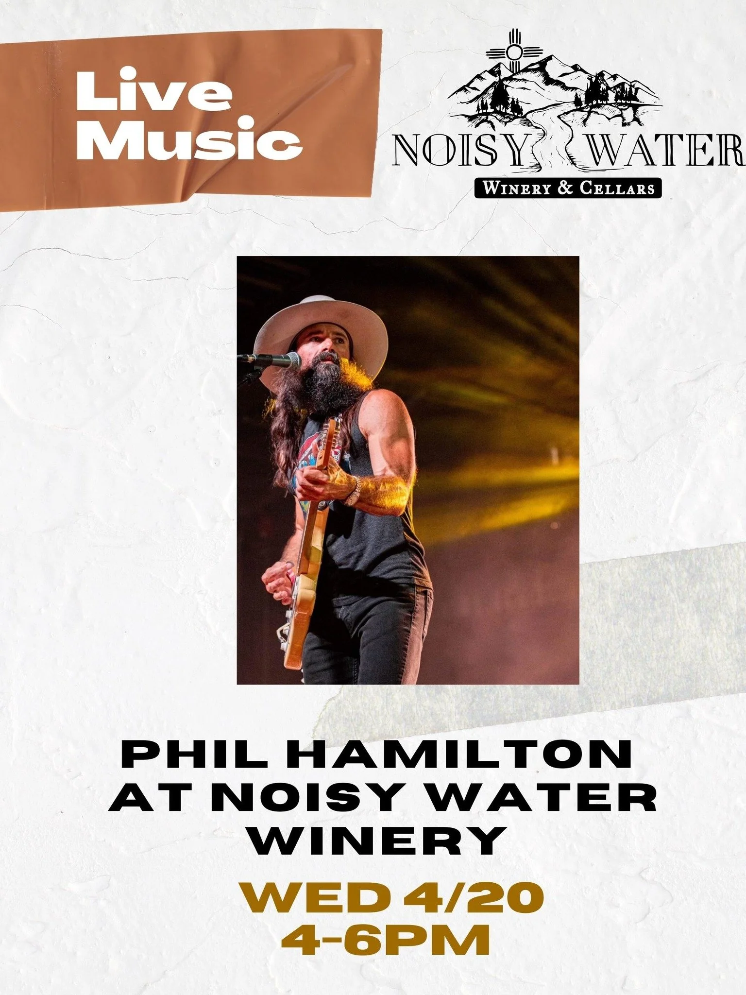 Stop by for live music with Phil Hamilton at Noisy Water Winery in Midtown Ruidoso on Wednesday, April 20, 2022. The music will be from 4-6 pm. Wine Down Wednesday deals will be from 3 pm to close.