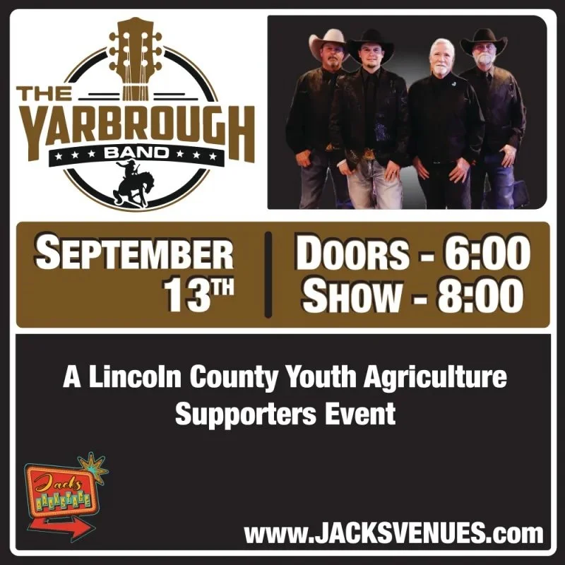 Don’t miss The Yarbrough Band live at Jacks Backstage on September 13! Doors open at 6:00 PM; the show starts at 8:00 PM. This high-energy country performance is part of a special Lincoln County Youth Agriculture Supporters event. Join the fun, support a great cause, and get your tickets at https://tickets.holdmyticket.com/tickets/448736?tc=hmt