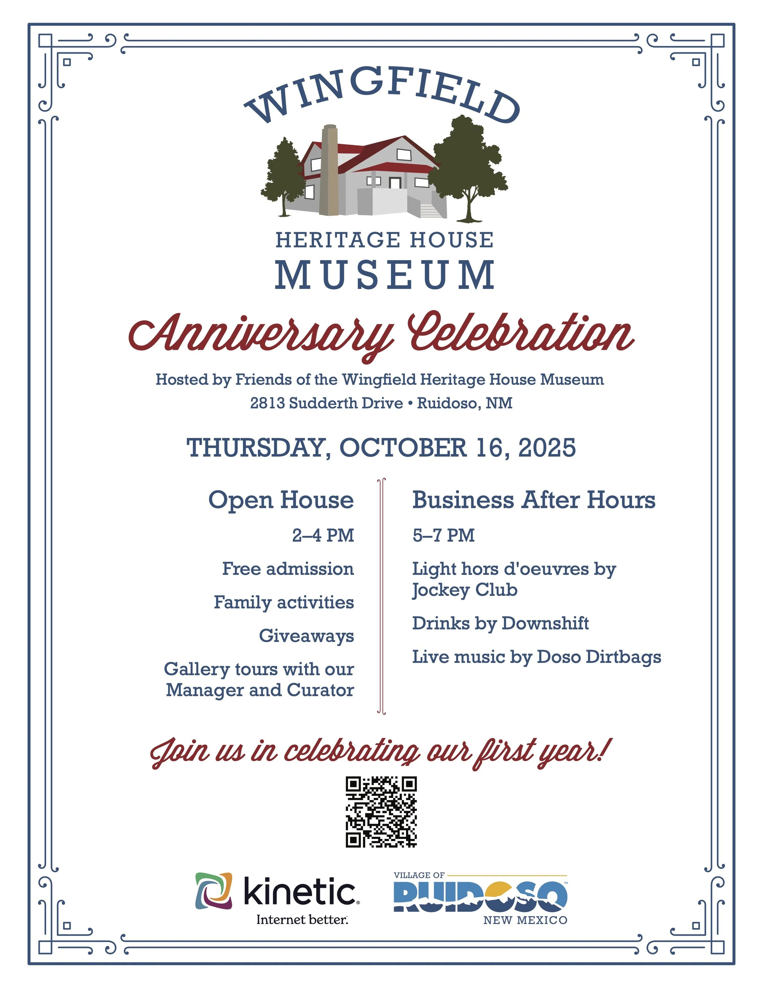Celebrate the Wingfield House Heritage Museum's one-year anniversary on Thu, Oct 16! Stop by the 2–4 PM Open House with giveaways, activities, and curator-led tours. Then enjoy Business After Hours, 5–7 PM, with light hors d’oeuvres from the Jockey Club, drinks from Downshift Brewing, and live music by the Doso Dirtbags.